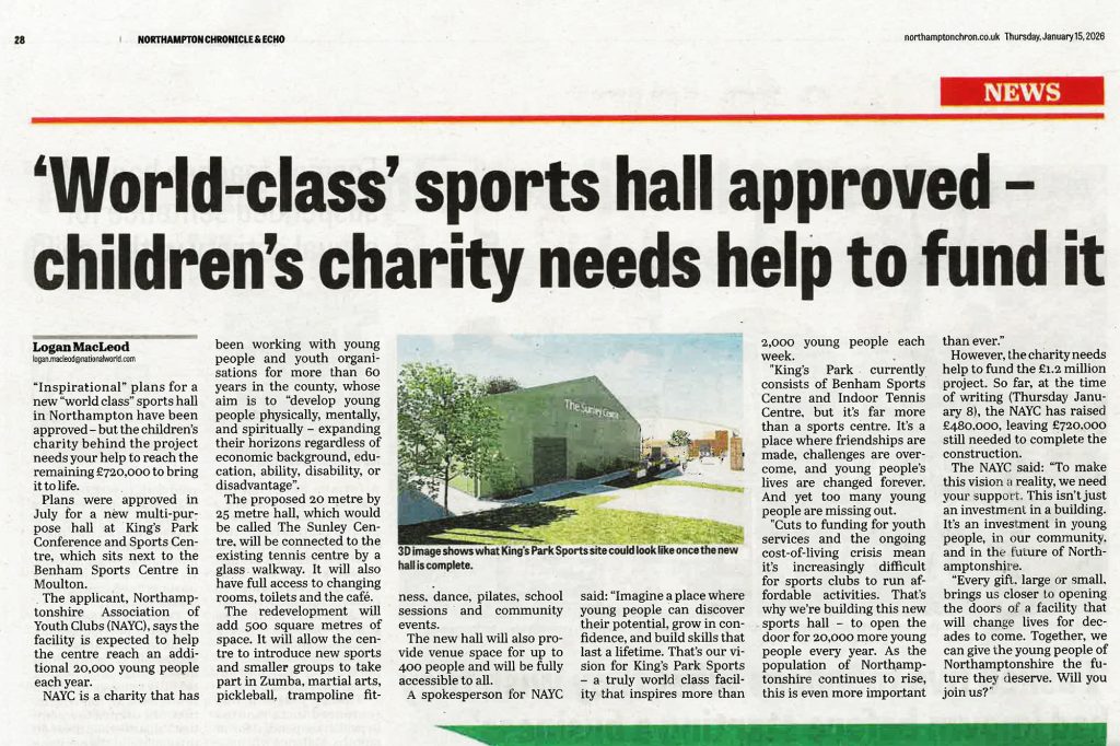 Extract from the Northampton Chronicle and Echo on 15-Jan-2026 featuring the NAYC Kings Park Multi-Purpose Hall that MEB Design secured planning permission for in July 2025. - Read More